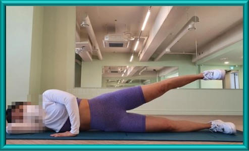 1. 바닥에 옆으로 누워서, 머리 아래에 아래팔을 두고 다른 팔은 몸 앞으로 뻗은 채로 상체를 지탱한다.