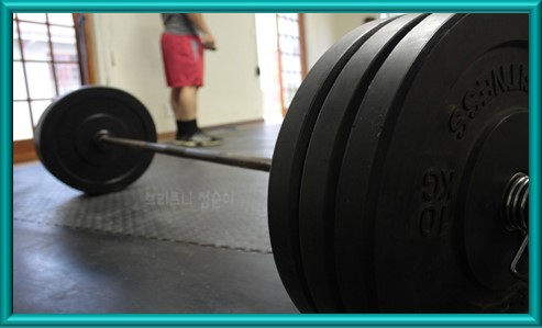 1. 발을 어깨너비로 벌리고 바벨을 발 앞에 놓습니다.