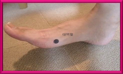 - 자극 방법: 엄지나 지압봉을 사용하여 시계 방향으로 약 5분 동안 누릅니다. 발에 있는 지압 점이므로 발목을 돌려 부드럽게 풀어줄 수도 있다.
